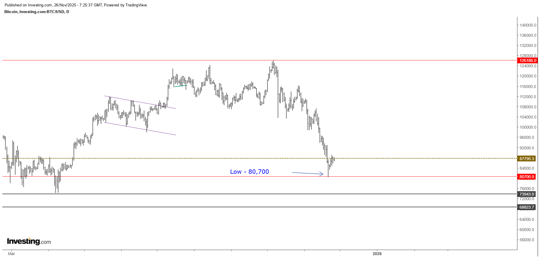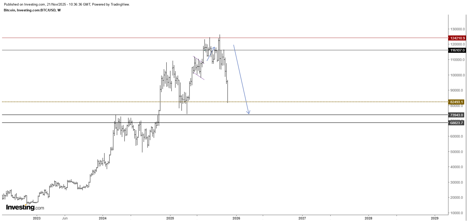 The price reached the minimum expectation of $99,000, but the bounce that followed was limited to $107,000 before the decline resumed. This confirmed our primary outlook for a deeper fall toward the $75,000–$69,000 zone. As of now, Bitcoin has made a low of $80,700, which is approximately a 35% decline from the $125,000 high