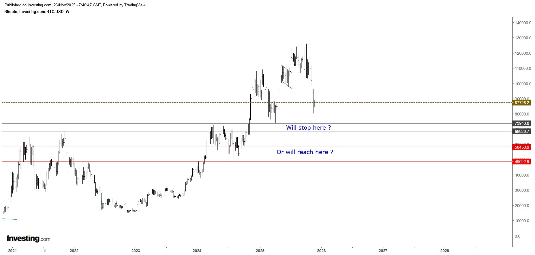 There is a possibility that Bitcoin could extend its decline toward the $58,000–$49,000 region.