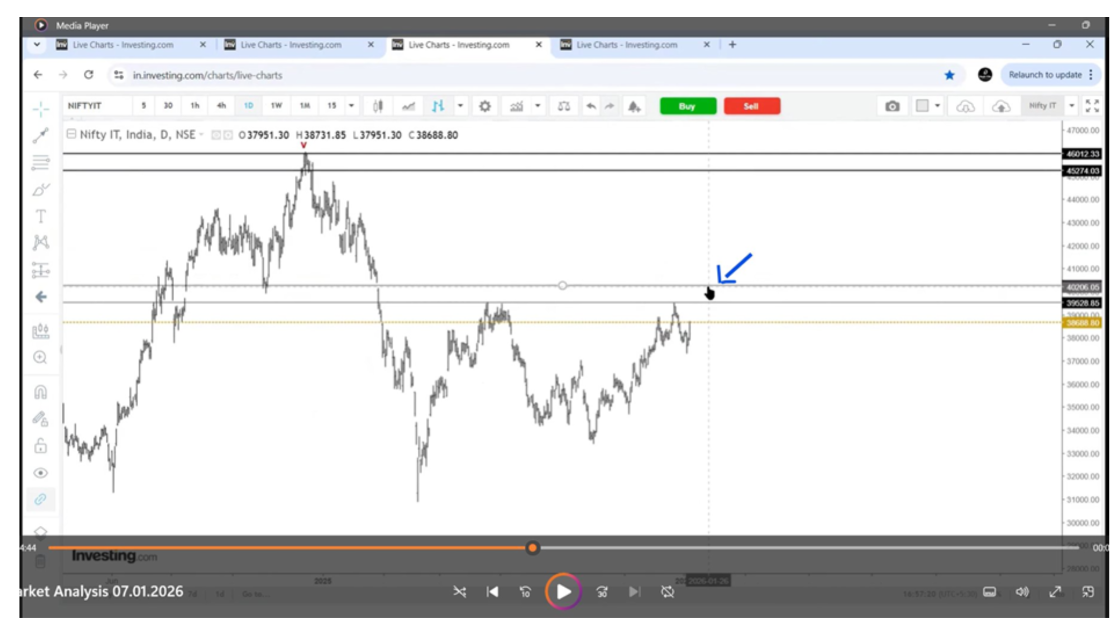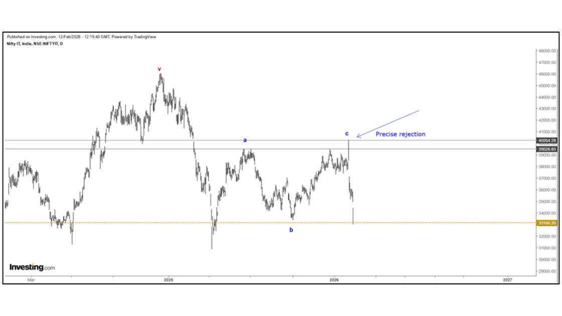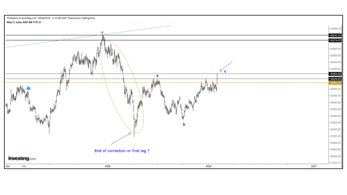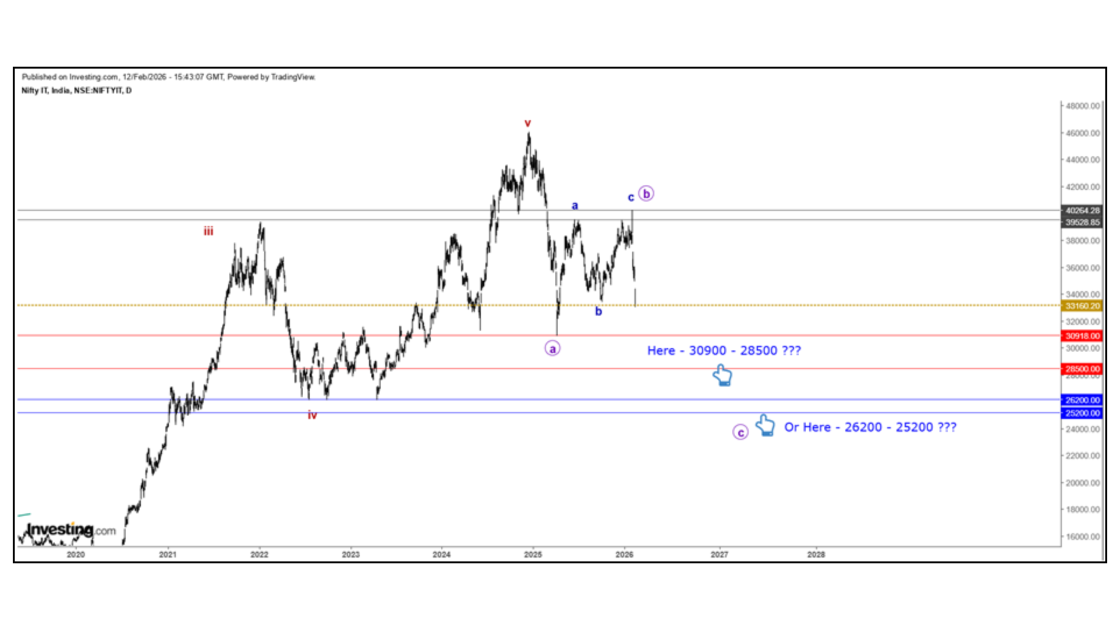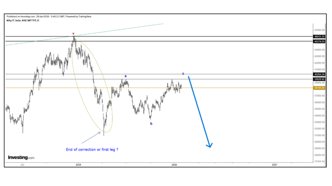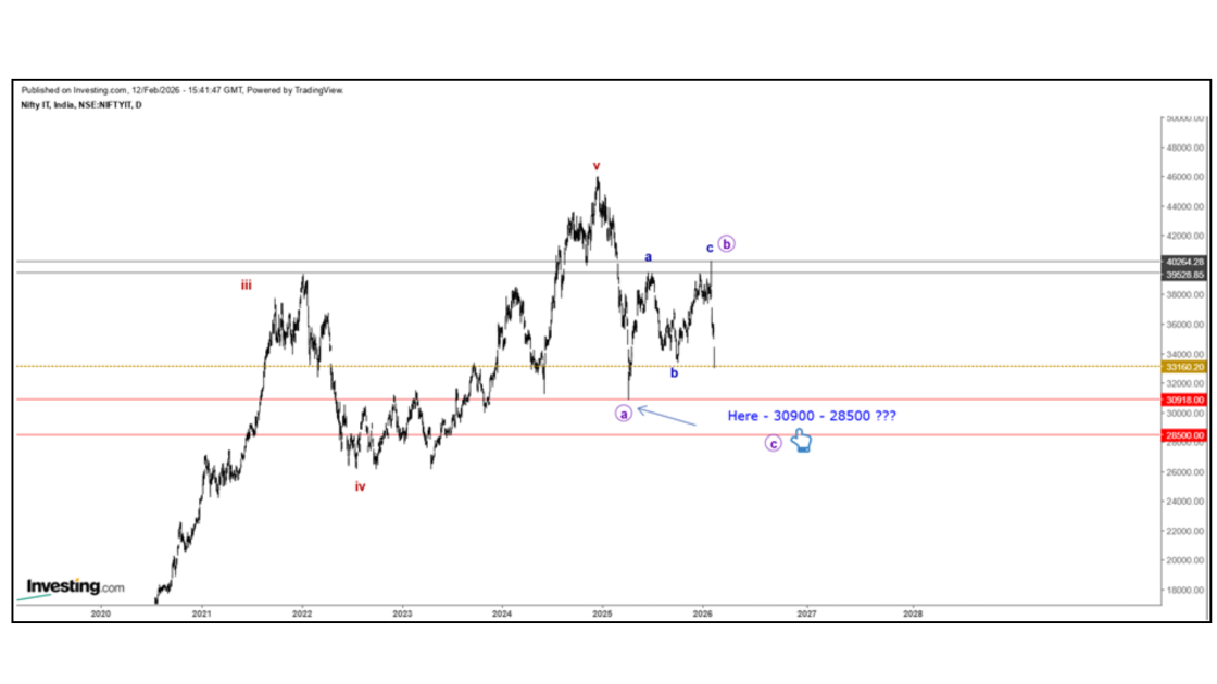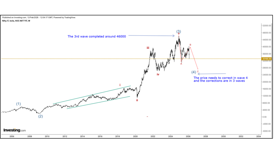 To answer this, we must examine the IT sector on higher timeframes rather than focusing on short-term price movements. On the weekly chart, the third wave appears to have completed near the 46,000 level. Following this, a fourth wave correction unfolded, which eventually pushed the index below 31,000. This marks a decline of roughly 15,000 points —a drawdown of more than 30% from the peak.